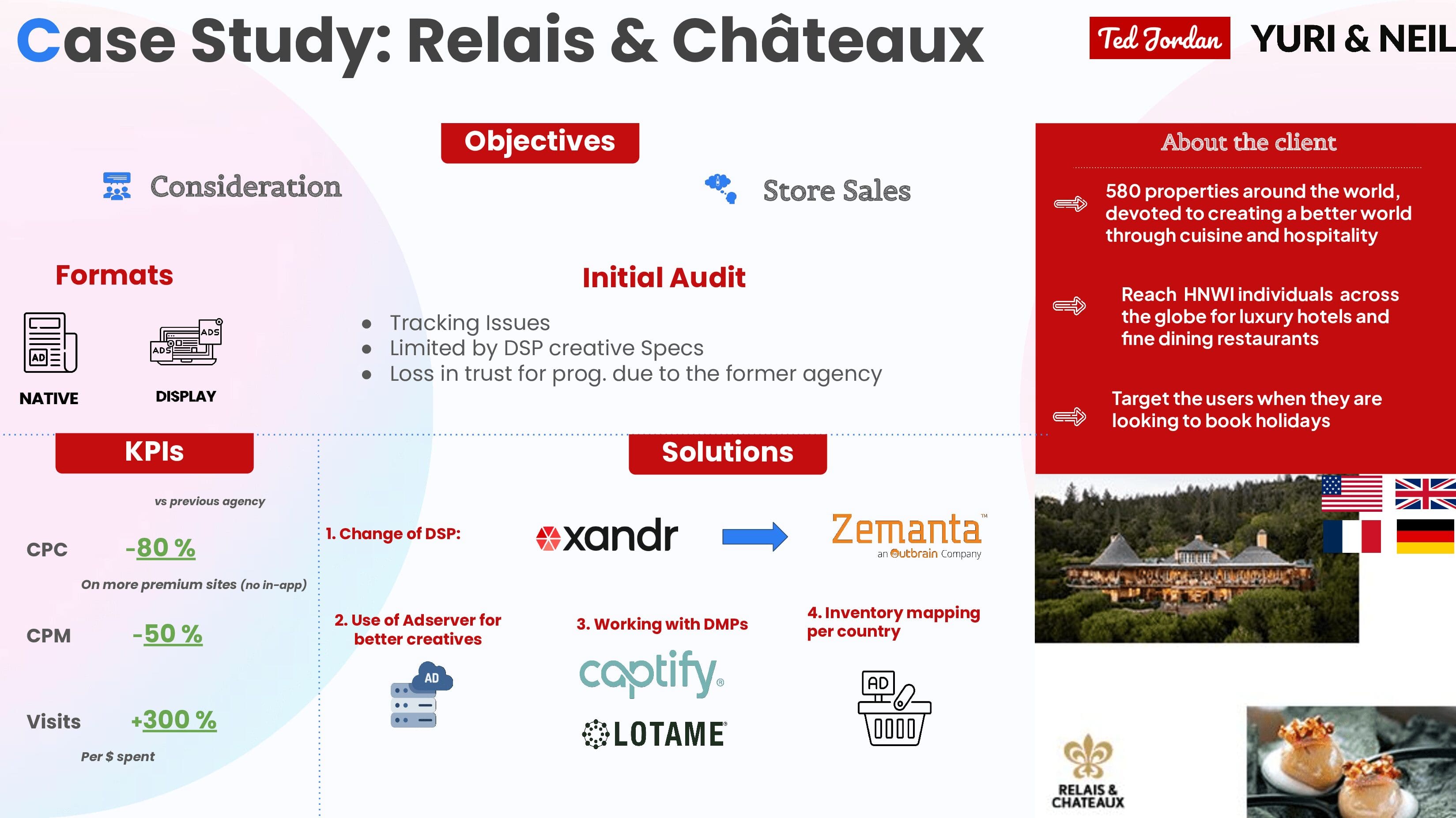 Our consultant, Ted Jordan, will offer you different strategies to reach your goals: programmatic advertising, analytics services, SEO, PPC campaigns, help with brand awareness, the use of omnichannel platforms such as DSPs with DOOH or audio campaigns, etc.